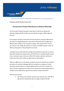 ‘2012 was a difficult year for the industry, certainly for heavy side manufacturers, and 2013 is also likely to be extremely challenging. Light side manufacturers are going to be heavily reliant upon exports if they are to achieve significant growth in the next 12 months. Yet, risks for product manufacturers are clearly on the downside due to the prevailing economic conditions and the effectiveness of government initiatives to boost construction.